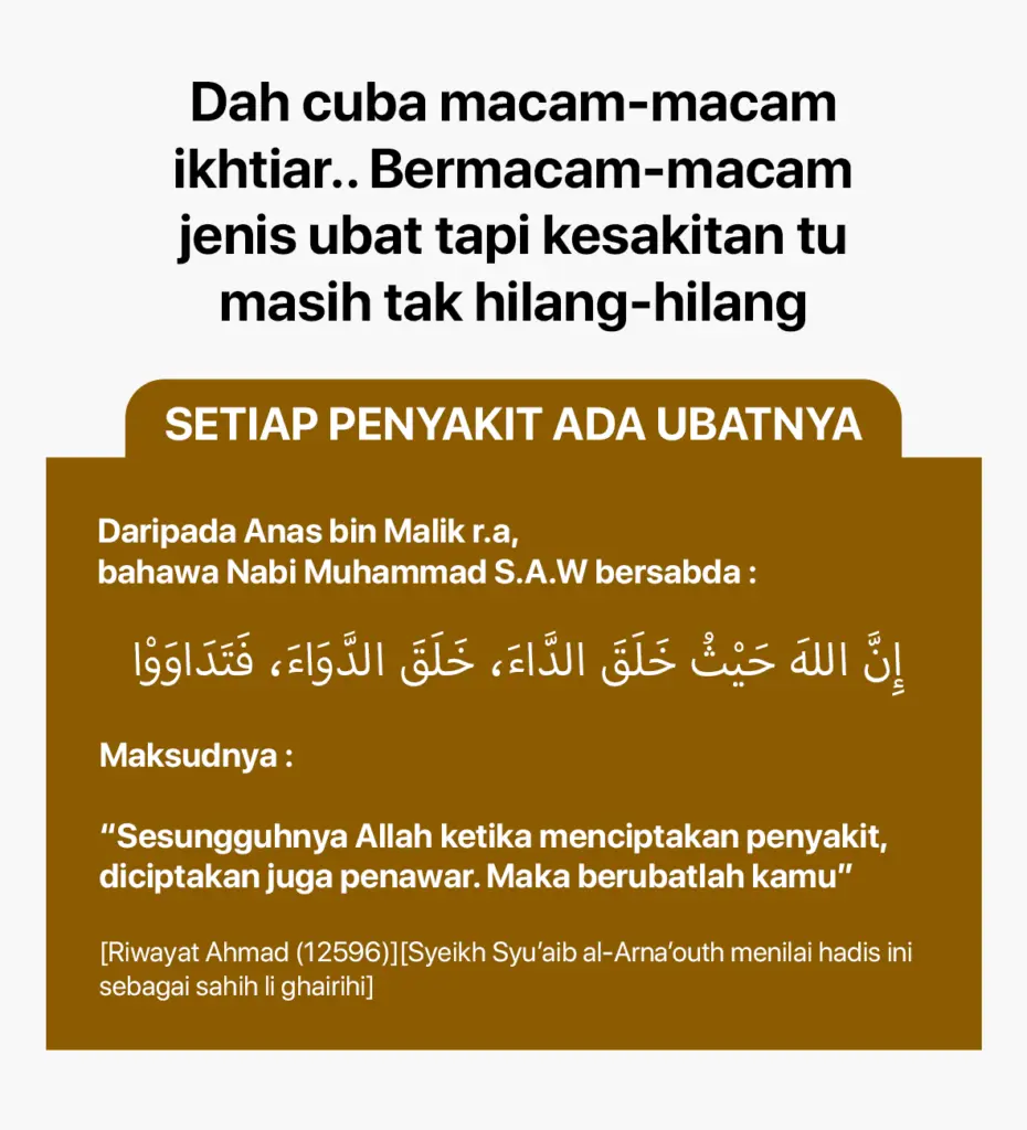 *PENAFIAN: Keberkesanan produk ini bergantung kepada kesesuaian individu. Setiap hasil dari penggunaan adalah berbeza bagi setiap individu. Produk ini akan memberi kesan terbaik sekiranya pengguna mengamalkan dengan cara betul berdasarkan banyak testimoni yang diperolehi. Kita berikhtiar, tuhan yang menyembuhkan.